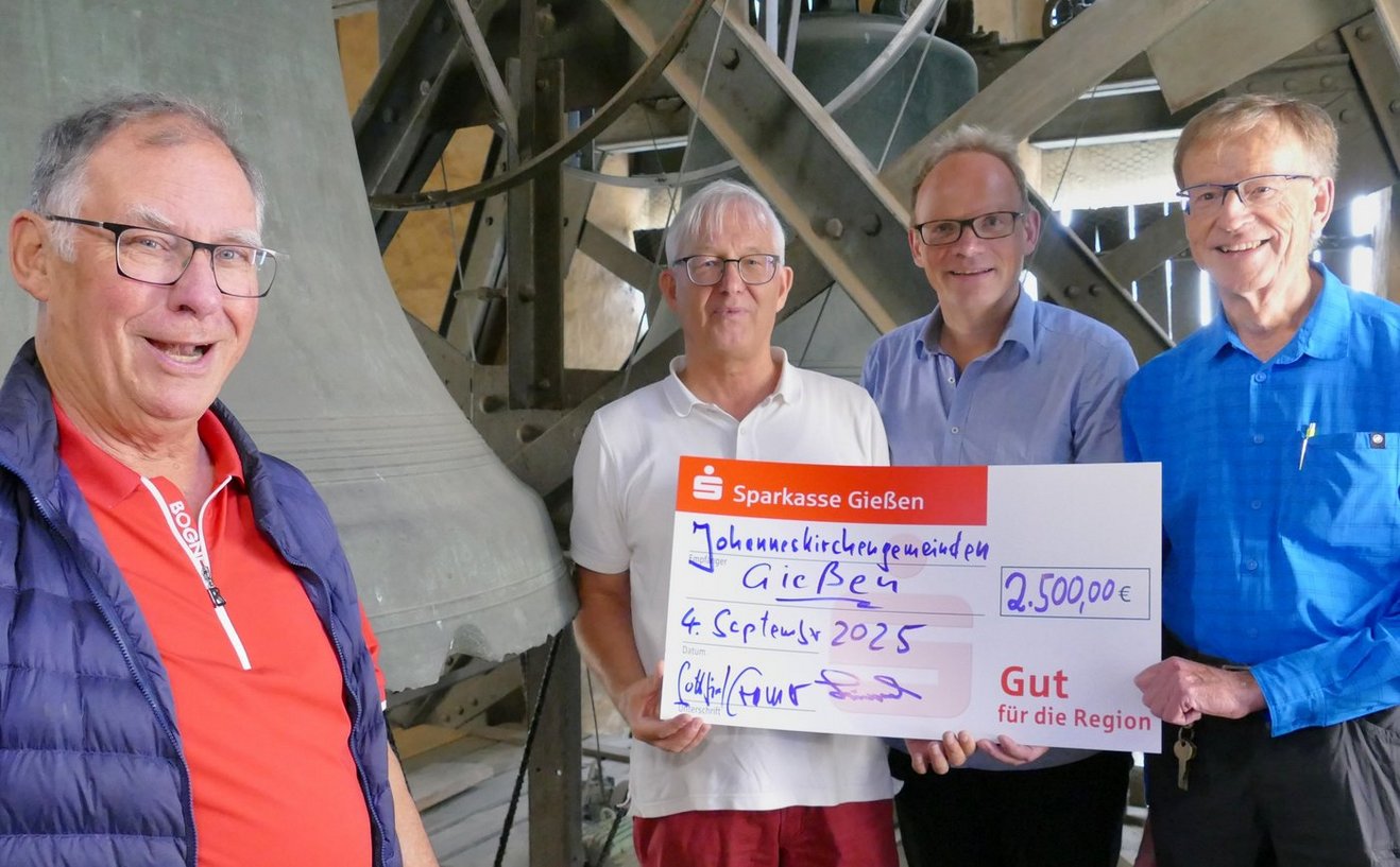 Gießen. Am 4. September 2025 überreichten Gottfried Cramer und Wolfgang Launspach vom Vorstand des Vereins zur Erhaltung der Johanneskirche Gießen e.V. einen symbolischen Scheck in Höhe von 2.500 Euro an die Vorsitzenden der Johanneskirchengemeinden Gießen-Mitte und Johannes, Pfarrer Matthias Weidenhagen und Klaus Busch. Die Übergabe fand – passend zum Zweck der Spende – im Glockenstuhl der Kirche statt.